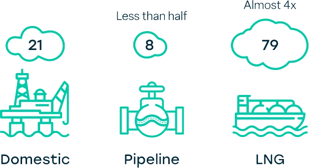 At 21 kg CO2/barrels of oil equivalent*, the average carbon intensity** of UK gas production is lower than the average carbon intensity of all sources of natural gas imported to the UK (except pipeline imports from Norway).